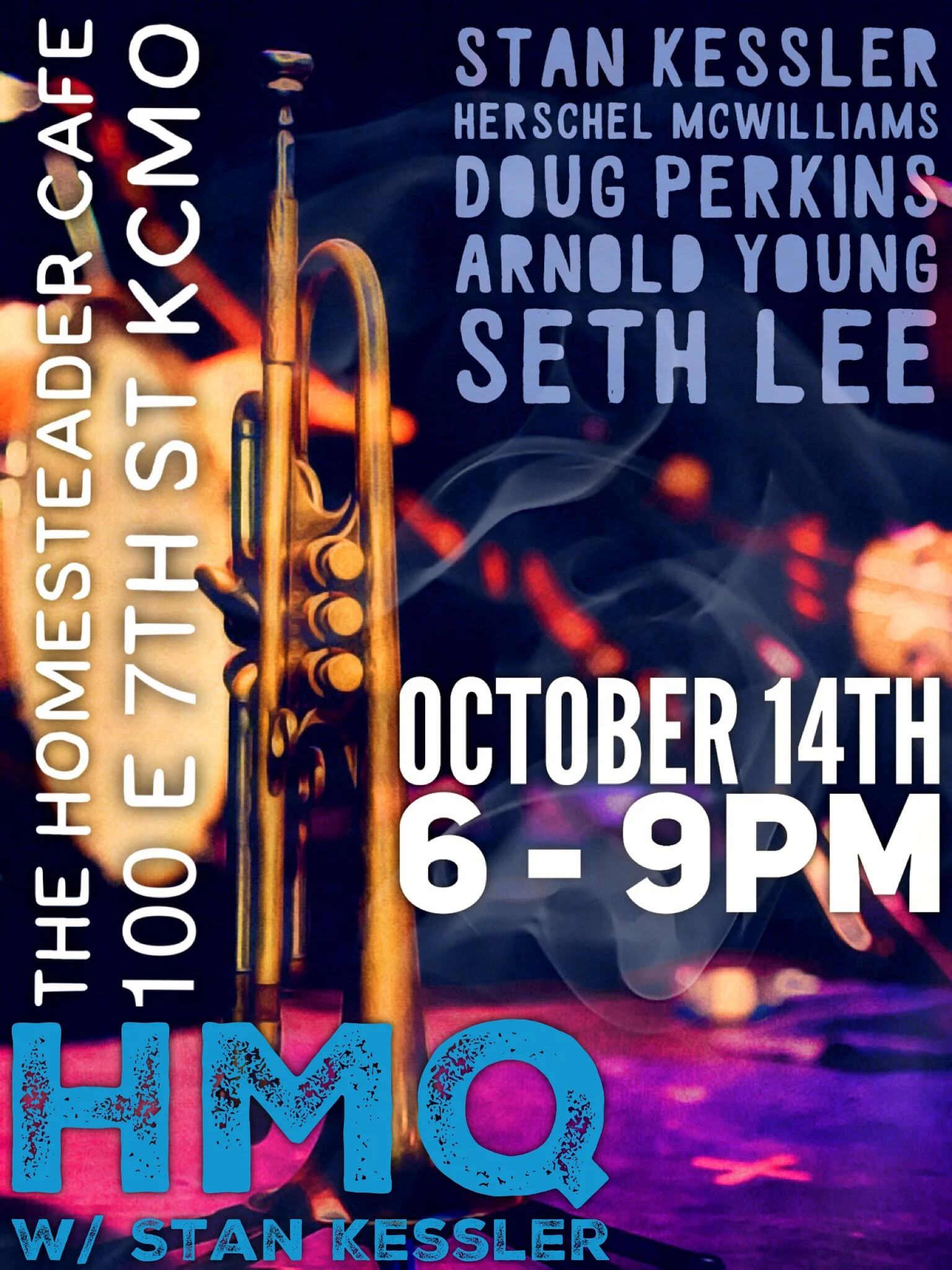 HMQ w/ Stan Kessler @ The Homesteader Cafe Friday, October 14, 2016 6:00 PM 9:00 PM 18:00 21:00 The Homesteader Cafe 100 East 7 Street Kansas City, MO, 64106 United States (map) Google Calendar ICS Herschel McWilliams Quartet featuring Stan Kessler (trumpet)Doug Perkins (guitar) Seth Lee (bass) & Arnold Young (drums)