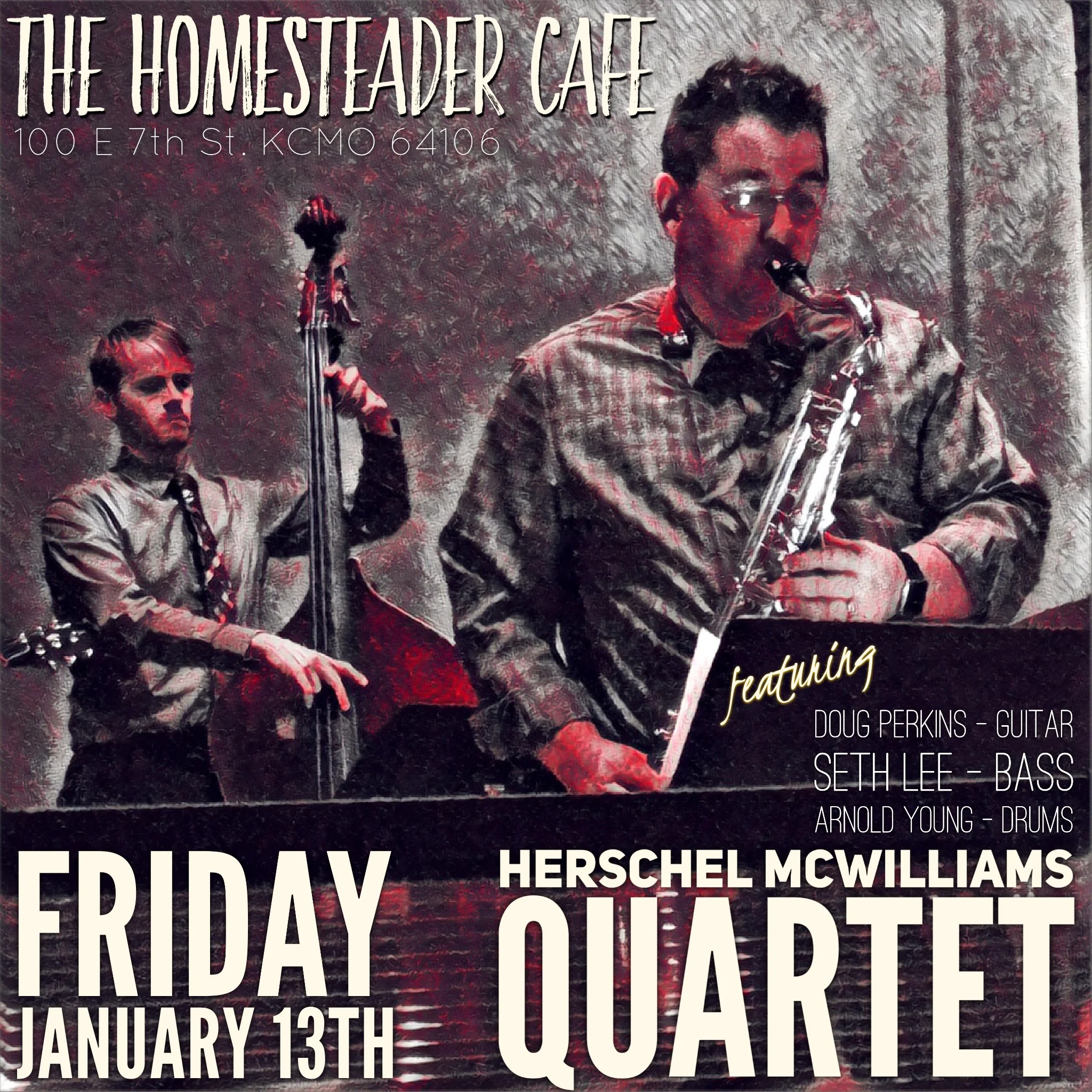 HMQ @ The Homesteader Cafe Friday, January 13, 2017 6:00 PM 9:00 PM 18:00 21:00 The Homesteader Cafe 100 East 7 Street Kansas City, MO, 64106 United States (map) Google Calendar ICS Herschel McWilliams Quartet Live at The Homesteader CafeSeth Lee - Bass / Doug Perkins - Guitar / Arnold Young - Drums